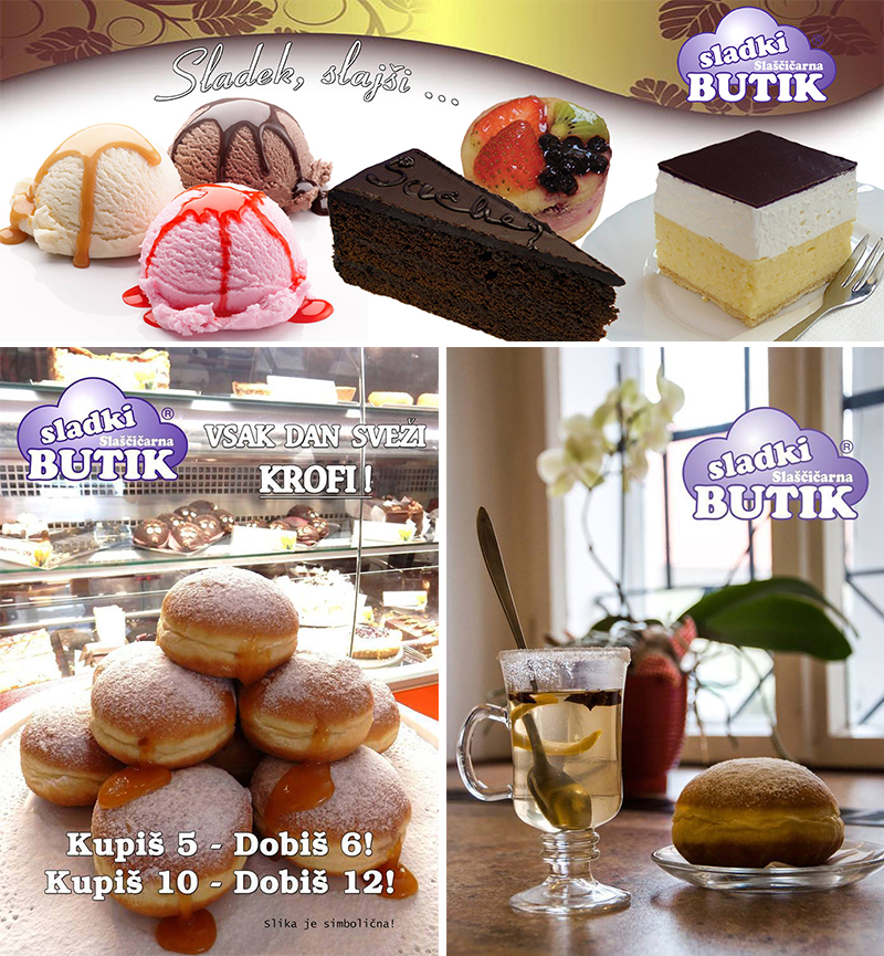 Sredi mestnega vrveža boste v umirjenem ambientu naše slaščičarne ob dobri kavi in osvežilnih napitkih, našli tudi kaj manj sladkega, pa tudi kakšno drobno darilce za svoje najdražje. V prijetno urejenem gostinskem lokalu, pa vam postrežemo s toplimi napitki, osvežilnimi pijačami, sladoledom in velikim izborom dnevno svežega peciva. Oglejte si delček naše ponudbe na novi spletni strani in nas obiščite v Sladkem butiku na Vinarskem trgu na Ptuju!